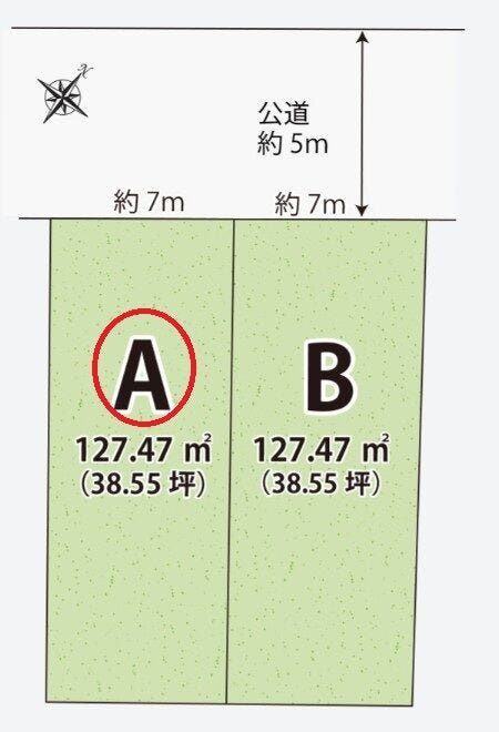 土地面積 127.48㎡(38.56坪) 接道 北西側(公道)幅 約5.0m 間口 約6.90m