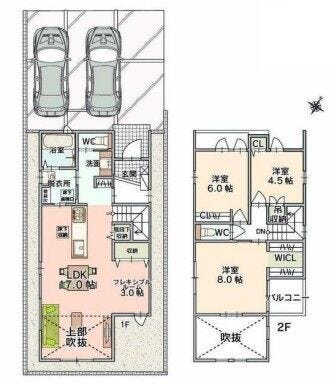 3LDK♪上部吹抜の17帖のLDK♪フレキシブルに使えるスペース付♪洗面浴室へは2wayで家事動線もスムーズ♪WICなど全居室やリビングなど収納充実♪全居室2面採光、風通りも良好♪